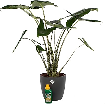 Zimmerpflanze Von Botanicly Elefantenohr In Anthrazitfarbenem Ubertopf 250 Ml Dunger Als Set Hohe 100 Cm Alocasia Zebrina Amazon De Garten